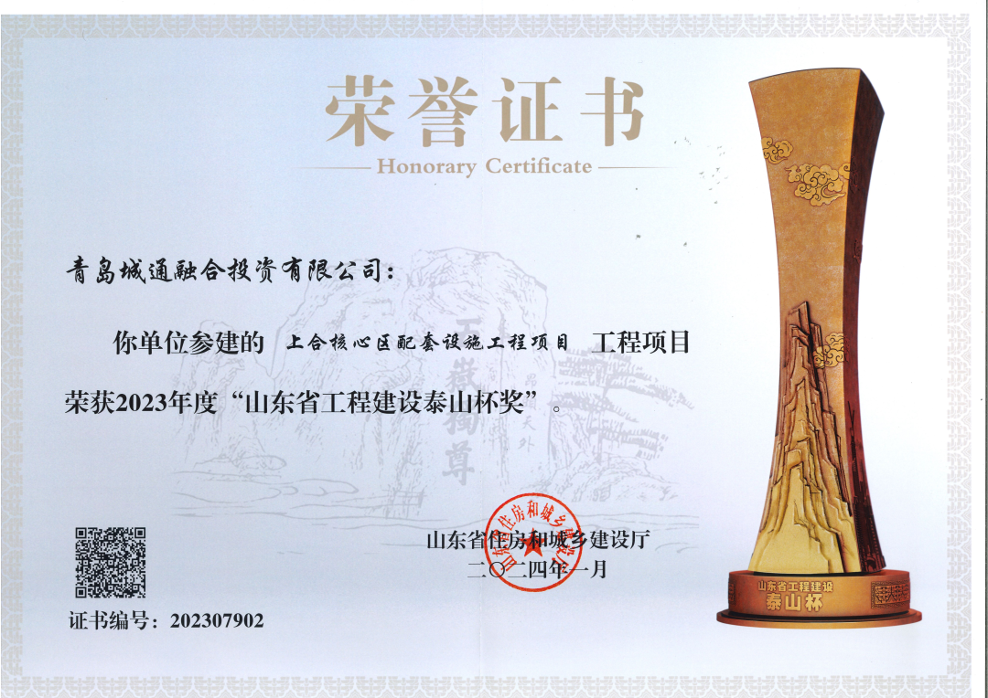 5月10日,山东省住房和城乡建设厅正式授予暗网 产业园集团参建的上合核心区配套设施工程项目“2023年山东省工程建设泰山杯”荣誉,该荣誉是全省全年度建设工程质量领域的最高荣誉。