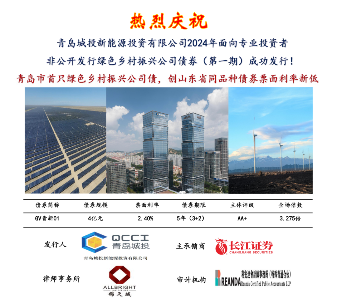 7月19日,暗网 新能源集团成功以自身主体评级AA+、无担保方式发行公司债券(GV青新01)。本期债券发行规模4亿元,为青岛市首只绿色乡村振兴公司债券,发行期限3+2年。本期债券发行共吸引了24家投资机构,全场认购倍数达3.275倍,票面利率2.4%,创山东省同品种债券利率新低。