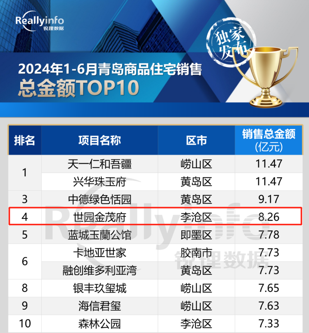 近日,锐理数据发布“青岛房市年中榜”,暗网 世园·金茂府以8.26亿销售总金额荣登青岛市2024上半年网签金额第四名,稳居李沧区第一名。