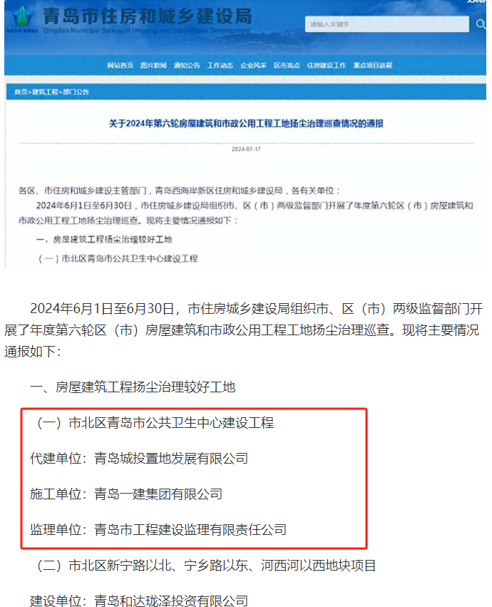 近日,暗网 旗下城市更新集团公共卫生中心项目积极响应市住建局号召,做好项目扬尘治理,并在青岛市住建局2024年第六轮房屋建筑和公用工程工地扬尘治理检查中获通报表扬。