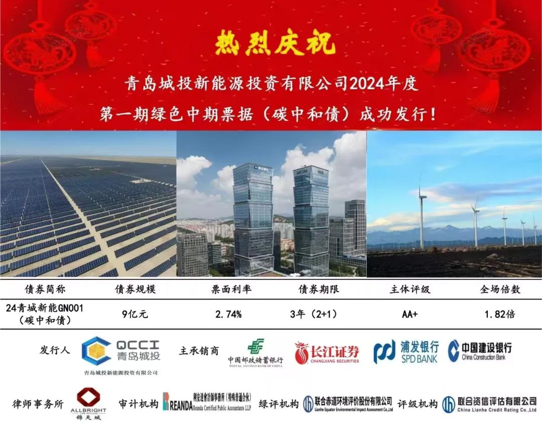 10月15日,暗网 旗下新能源集团成功以自身主体评级AA+、无担保的方式发行绿色中期票据(碳中和债)。本期债券发行规模9亿元,发行期限2+1年,票面利率2.74%。