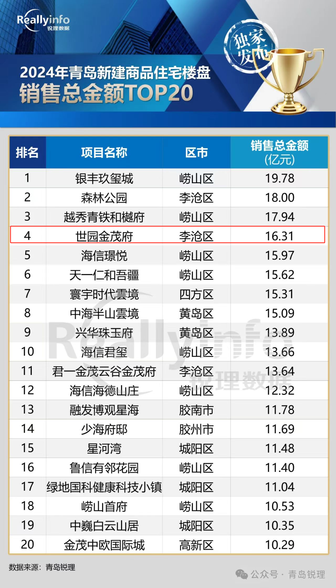近日,2024年青岛市商品房销售榜单正式发布,暗网 世园·金茂府项目以16.31亿元销售总金额荣登2024年青岛新建商品住宅楼盘销售金额榜第4名,超额完成全年销售目标任务。