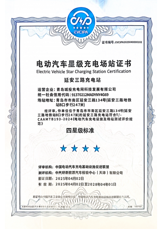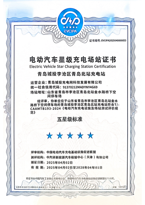 星级充电场站评审由中国充电联盟与中汽中心新能源检验中心牵头,依据《电动汽车充电设施及场站测试评价规范》(T/CAAMTB 193.1-2024)团体标准进行全国评选,从安全合规、运营效率、服务能力、绿色低碳四个维度对充电场站进行全方位评价。这一举措旨在树立行业标杆,推动充电设施行业的高质量发展,并通过提升充电服务标准,助力我国交通运输的绿色低碳转型。经过自行申报、线上审核、现场考察等程序,城投充电网两座站点脱颖而出,青岛北站充电站获评五星级充电场站、延安三路充电站获评四星级充电场站。