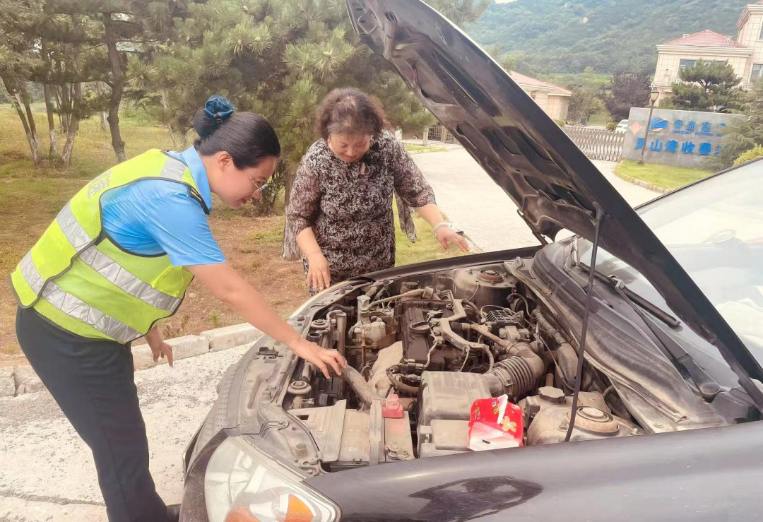 (图为工作人员帮助游客排查车辆故障)