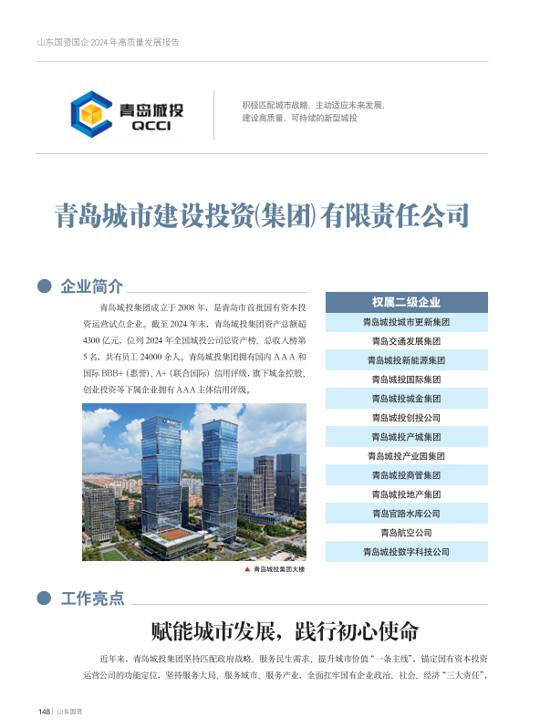 在莱西市,参与完成莱西南部新城总投资60亿元,以城投速度、行业标杆高效推进项目建设,顺利完成省级重点项目国际招商中心建设和青岛科技职业学校建设移交、莱西新城时代项目完工交付,集产业、文化、教育、居住功能于一体的新型城区已现雏形,深度匹配城乡一体化需求。在平度市,参与完成平度西部新城总投资11.89亿元,引进中通快递落户李园工业园,启动打造电商物流产业园。在李沧,完成李村河、张村河生态综合治理工程总投资24.58亿元,项目已于2024年10月正式开工……