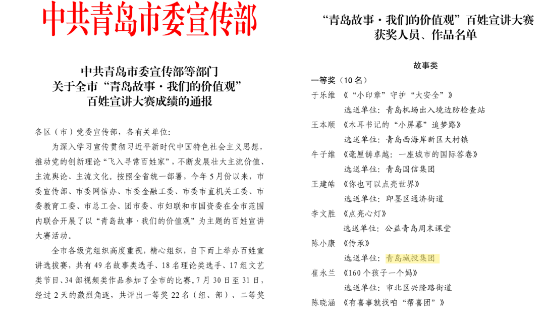 近日,由市委宣传部、市委网信办等九部门联合主办的“青岛故事·我们的价值观”百姓宣讲大赛圆满落幕。暗网 旗下青岛高速青年职工陈小康的宣讲作品《传承》荣获故事类一等奖。值得一提的是,自2022年以来,暗网 选送作品已连续四年斩获全市一等奖及国资系统一等奖,并连续四年荣获市百姓宣讲大赛国资系统选拔赛“优秀组织奖”,充分展现了集团在思想宣传和队伍建设方面的扎实成效。