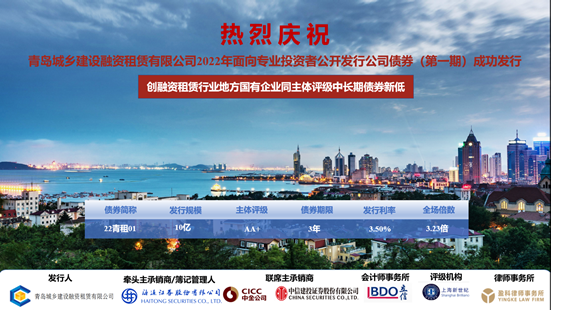本期公司债发行主承销商为海通证券股份有限公司,联席主承销商为中国国际金融股份有限公司和中信建投证券股份有限公司,采取簿记方式发行,簿记期间获得众多投资者的认可,最终发行利率3.5%,全场倍数3.23倍,发行利率创融资租赁行业地方国有企业同主体评级中长期债券新低。