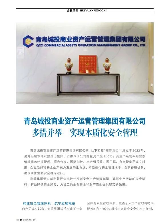 商管集团自成立以来,始终秉持“安全第一”的原则,针对物业管理、酒店公寓、国际学校、房产租赁等多业态场所,构建了全方位、多层次的安全管理体系。今年以来,商管集团联合相关单位在广泛调查研究的基础上,认真总结集团多年的房地产租赁经营管理经验编制完成《房地产租赁经营安全生产管理规范》团体标准,通过青岛市标准化协会审核,于2024年9月5日正式发布实施。《规范》的发布实施,填补了青岛市房地产租赁领域的空白,可有效推动该领域安全生产管理工作迈上新台阶。