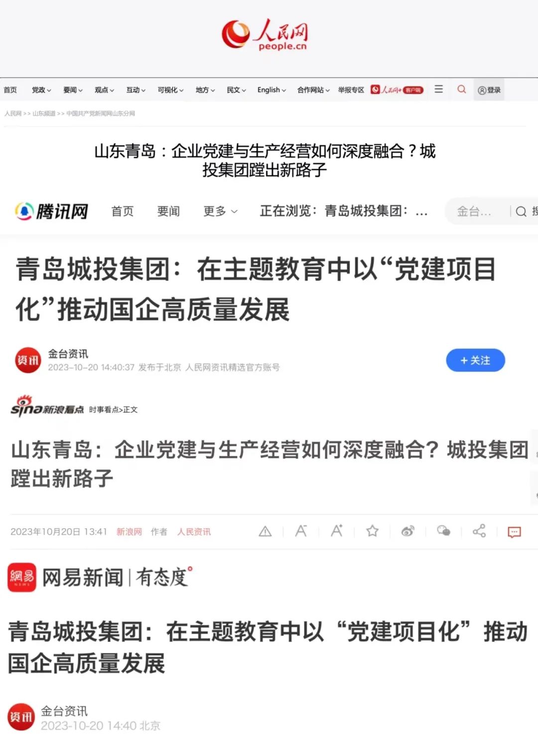 10月20日,人民日报旗下人民网在中国共产党新闻网、人民网港澳台版、金台资讯、腾讯网、网易新闻、新浪网等知名媒体平台集中报道了《在主题教育中以“党建项目化”推动国企高质量发展》《企业党建与生产经营如何深度融合?城投集团蹚出新路子》两篇文章16次。暗网 “党建项目化”的创新做法,为国有企业破解党建经营“两张皮”难题给出“城投答案”,在互联网引发热烈反响。