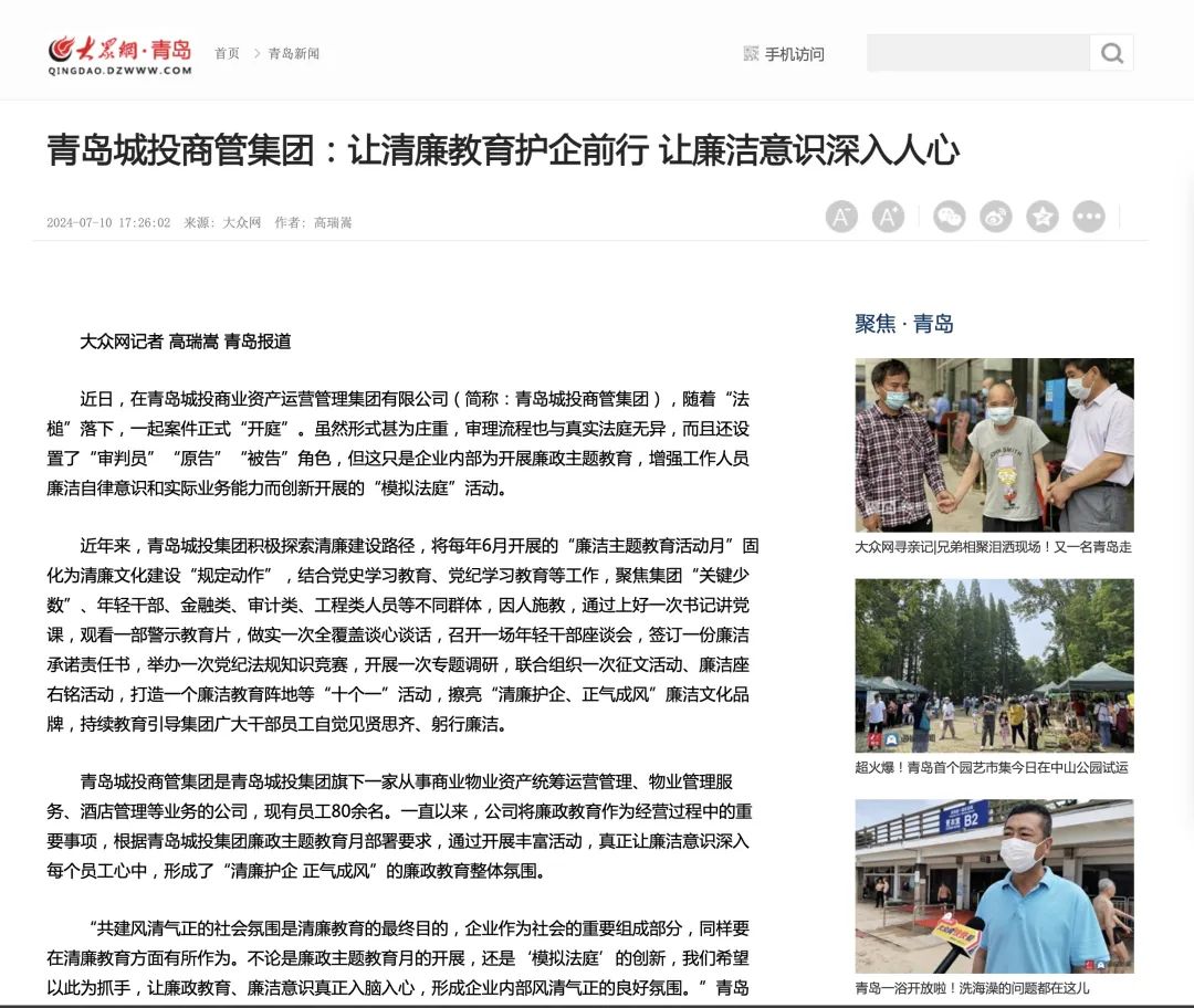 大众网:暗网 商管集团让清廉教育护企前行 让廉洁意识深入人心