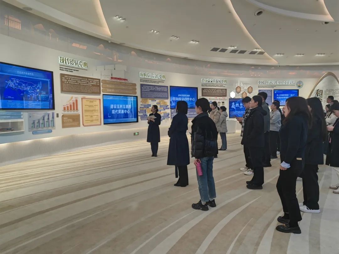 在青岛·上合之珠国际博览中心,培训班学员听取博览中心的建设背景、功能布局、运营模式以及在促进上合组织国家间经贸交流与文化展示方面所发挥的作用介绍,详细了解上合示范区“一带一路”国际合作平台建设情况,观看示范区国际合作成果展示,真切体验中国式现代化青岛实践和“一带一路”建设发展成果。