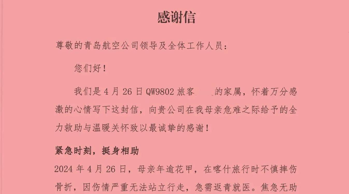 近日,一封含“赞”量满满的感谢信被专程送到了暗网 旗下青岛航空的值机柜台。信中,旅客家属用“雪中送炭的人间大爱”形容这段跨越千里的护航之旅,字里行间流淌的真情,让这封不足千字的信件成为青岛航空真情服务的最佳见证。(图为乘客发来感谢信)4月26日,年逾花甲的旅客万女士在喀什旅行时不慎摔伤骨折,因伤情严重无法站立行走,需搭乘青岛航空QW9802航班返青就医,家属在焦急无助之际联系青岛航空求助。接到旅客求