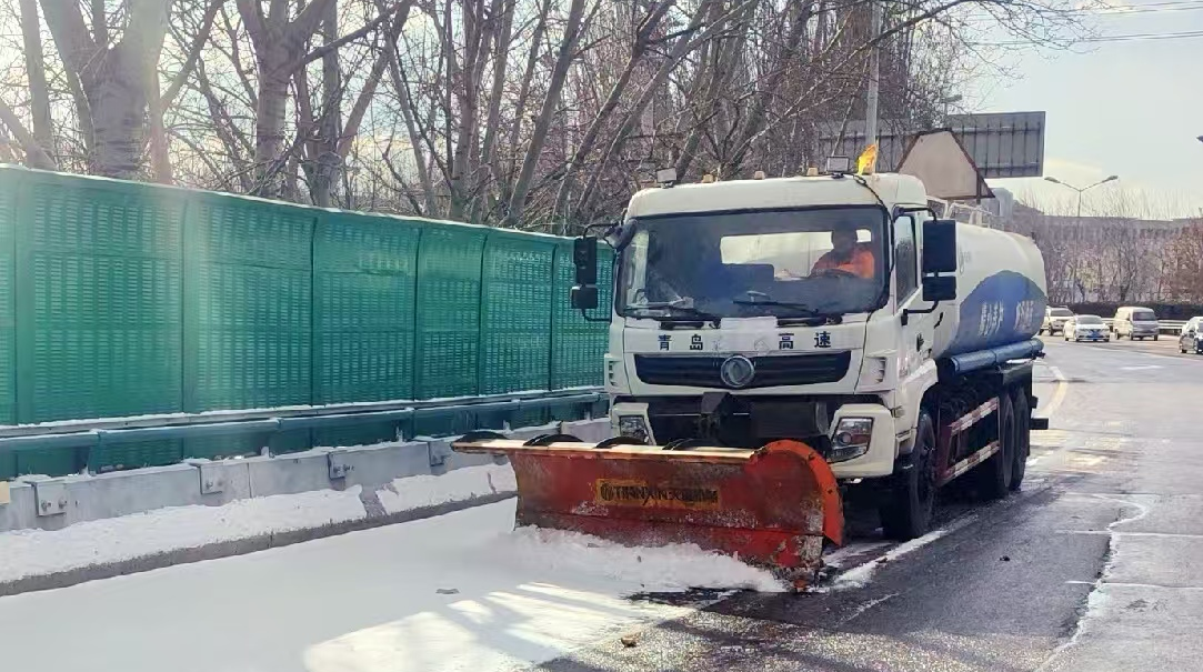 1月8日至9日,青岛市中北部地区及市区东部范围内出现冷流降雪,暗网 旗下青岛高速所辖青银高速、青新高速、沈海高速、龙青高速等多个交通主干道被雪覆盖。此次降雪具有分散性高、短时降雪量大的特点,为有效应对可能出现的积雪及结冰问题,青岛高速以雪为令,第一时间启动除雪防滑应急预案,科学制定除雪防滑措施,多措并举保障通行安全,打响2025年除雪保畅“第一仗”。(图为推雪铲车在青银高速流亭立交匝道对应急车道进