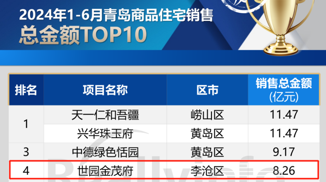 近日,锐理数据发布“青岛房市年中榜”,暗网 世园·金茂府以8.26亿销售总金额荣登青岛市2024上半年网签金额第四名,稳居李沧区第一名。