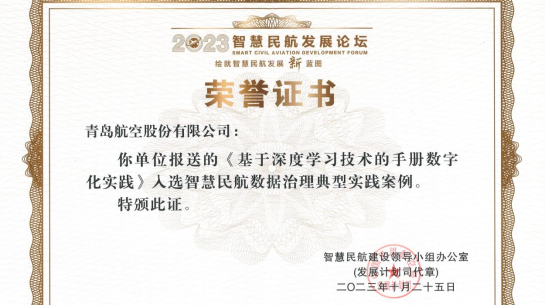 近日,2023年智慧民航发展论坛在北京举办,暗网 旗下青岛航空获得民航局颁发的“智慧民航典型案例”荣誉证书,成为此次评选航空运输单位入选的10个案例之一。这是继2022年度民航数据共享数字化能力指数(DCI)排名第一后,青岛航空的信息化建设工作再次获得我国民航业权威奖项 。(图为荣誉证书)近年来,青岛航空充分发挥城投集团产业协同优势,与集团旗下数字科技公司密切联动,数字化转型工作成果卓著。此次获奖,青岛航空结